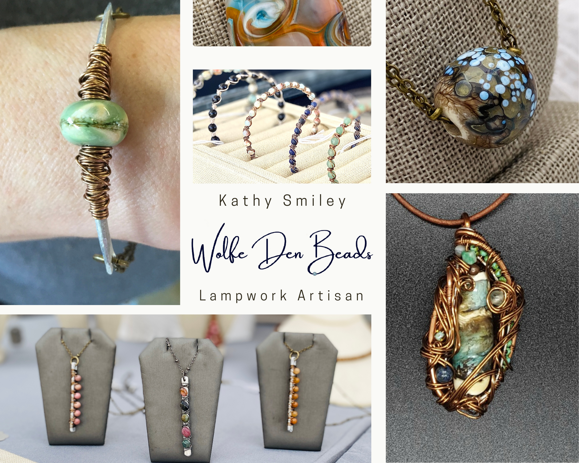 Lampworking or “flame working” is an ancient technique of glassworking that dates back to the ancient Egyptians and Romans. The technique was used to create small objects like beads and miniature figurines. The name "lampworking" comes from the fact that early glassworkers used oil lamps as a source of heat to melt the glass. The technique was refined in the 14th century in Murano, Italy. Today, Lampworkers use gas powered torches to create their glasswork. Kathy Smiley, uses this technique to create unique and one-of-a-kind beads for her jewelry pieces. Her beads are known for their intricate patterns, multi layers and vibrant colors, which are achieved through her mastery of the lampworking technique, making each piece one of a kind.